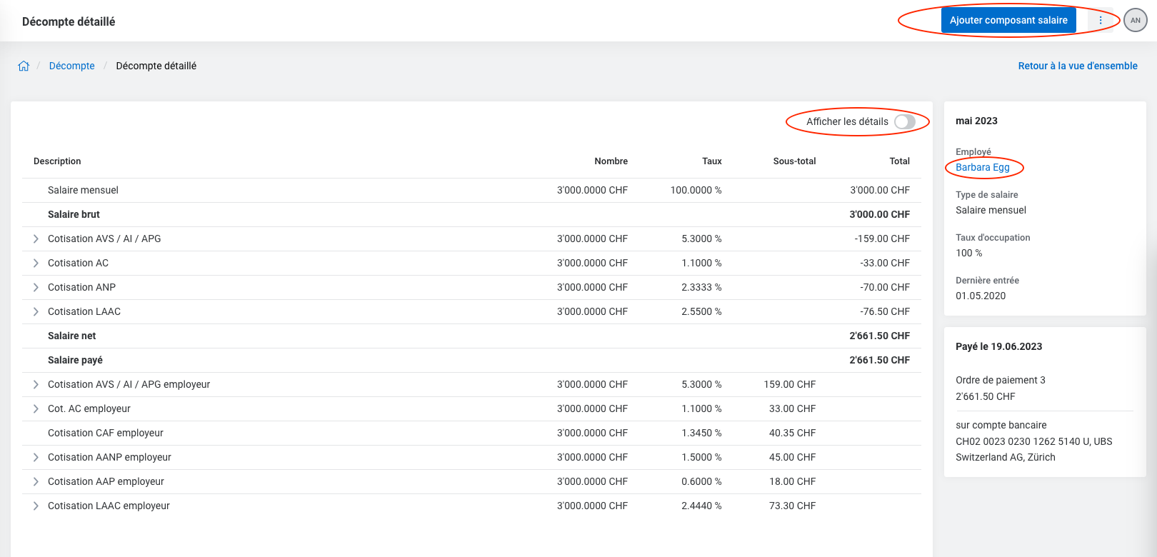 Les décomptes détaillés affichent, comme jusqu'à présent, les composants salaires contenus dans le décompte. Les détails peuvent désormais être affichés ou masqués à l'aide du commutateur "Afficher les détails". En cliquant sur une ligne, un composant salaire peut être adapté ou supprimé, dans la mesure où le composant salaire permet une modification.