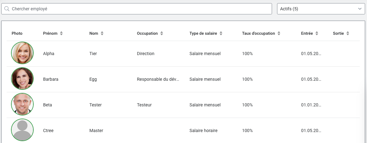 L'aperçu des employés affiche au choix les employés actifs / inactifs (selon les entrées / sorties). L'avatar est encadré en vert chez les employés actifs et en rouge pour les employés sortis ou qui ne sont pas encore entrés. L'ancienne représentation par cartes n'existe plus.