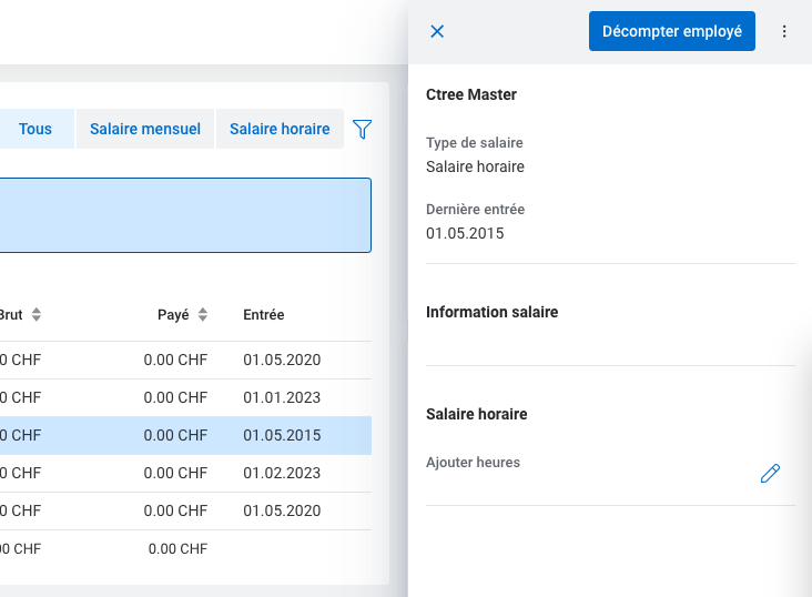 Un panneau latéral s'ouvre dans le bord droit en cliquant sur une ligne / personne. Différentes actions peuvent être exécutées à l'aide du bouton bleu et du menu à trois points. Celles-ci se rapportent toujours à la personne sélectionnée. Pour les employés décomptés, on peut afficher les détails de décompte en cliquant sur "Détails".