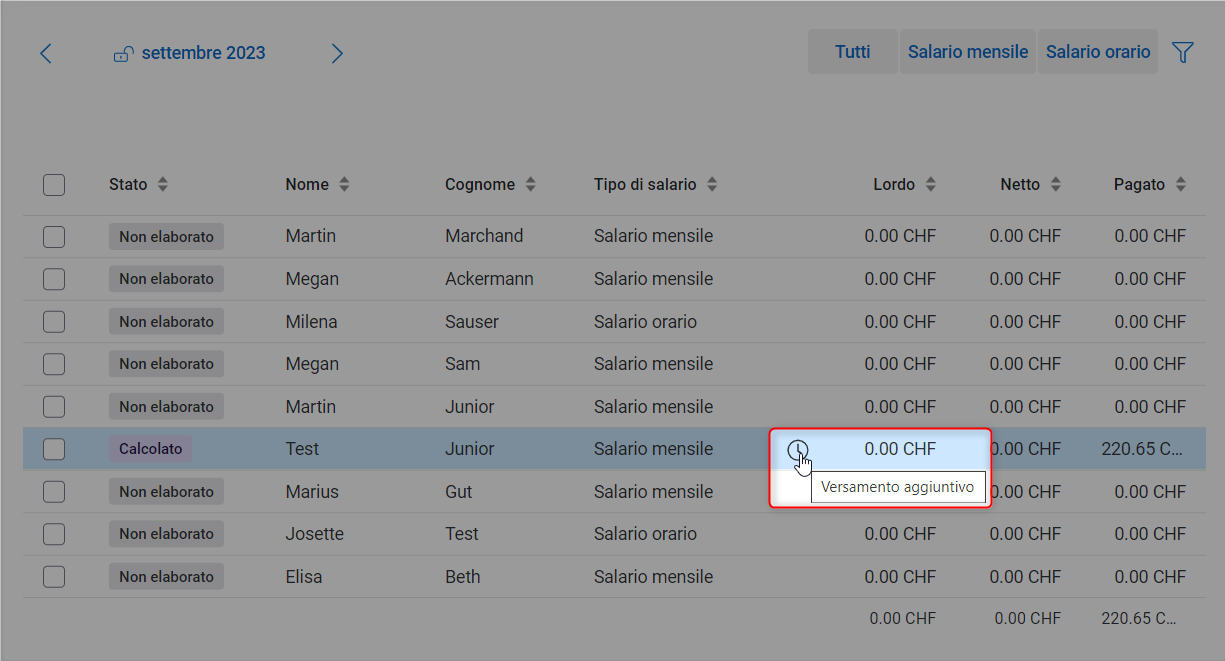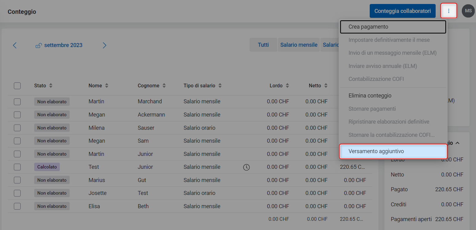 Il collaboratore trattato apparirà quindi nella lista dei conteggi con l'indicazione "Versamento aggiuntivo":