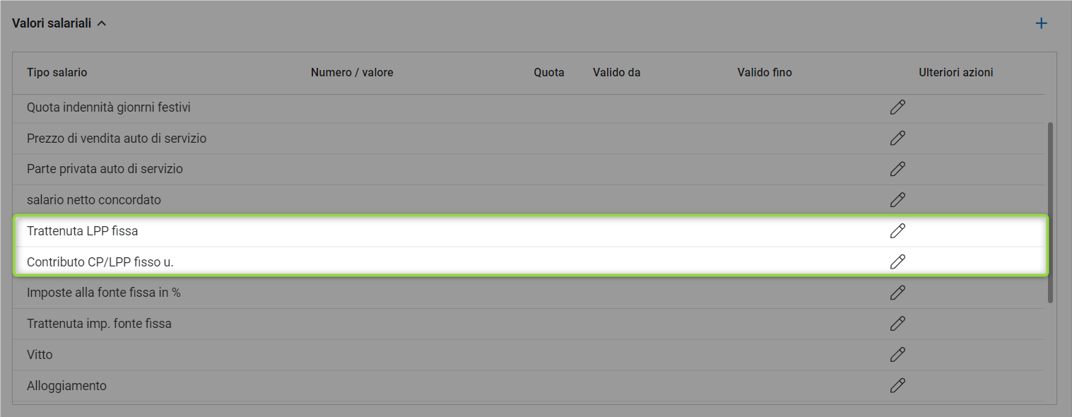 Si prega di notare che il sistema tiene conto di un solo contratto assicurativo LPP. Se, secondo il vostro contratto assicurativo, disponete di un'assicurazione obbligatoria + sovraobbligatoria, dovete calcolare voi stessi l'importo e inserirlo manualmente nei dati salariali del collaboratore, utilizzando il tipo di salario "Trattenuta LPP fissa":