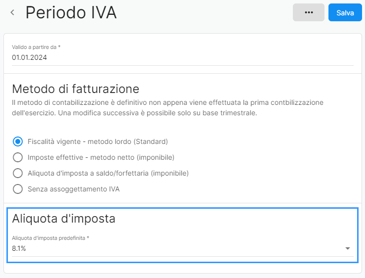 Creando un nuovo periodo IVA o modificando l'aliquota d'imposta predefinita e specificando un'aliquota IVA valida dal 01.01.2024 (ad es. 8.1%), nei documenti dei clienti viene proposta di default l'aliquota IVA corrispondente, a meno che non sia stata memorizzata un'aliquota IVA su un prodotto.