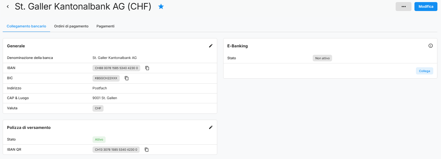 Nella nuova visualizzazione è possibile vedere a colpo d'occhio tutti i conti bancari attivi e inattivi. Ogni conto viene visualizzato con dettagli importanti come il nome (logo) della banca, l'IBAN, la valuta e lo stato del collegamento all'e-banking. Per i singoli conti è possibile visualizzare e gestire direttamente gli ordini di pagamento in sospeso e i pagamenti eseguiti.