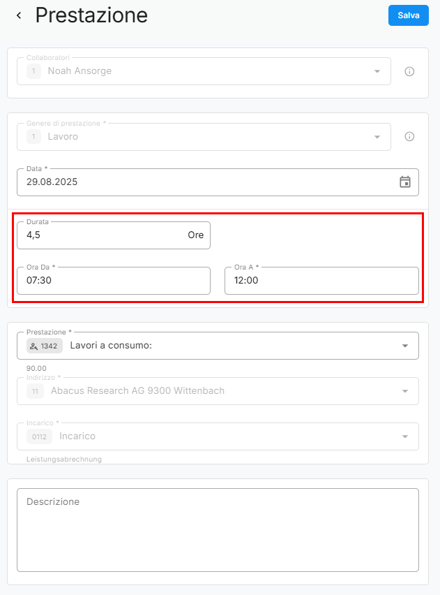 Se nell'area della registrazione delle prestazioni si modifica l'indicazione dell'ora o della durata, gli altri due campi vengono automaticamente adeguati di conseguenza. Ciò significa che, ad esempio, in caso di modifica della durata in ore, l'ora di inizio o di fine viene calcolata e aggiornata direttamente e viceversa. Questo collegamento consente di evitare calcoli manuali e garantisce una registrazione coerente e corretta del tempo e delle prestazioni.