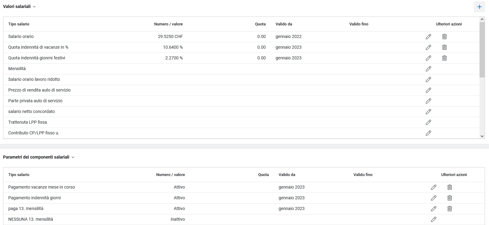 In "Valori salariali" è necessario configurare i componenti "Quota indennità di vacanze in %" e "Quota indennità giorni festivi" con le quote concordate nel contratto di lavoro / CCL o in vigore secondo la legislazione cantonale.