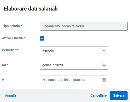 È possibile che il versamento delle indennità venga effettuato su più periodi. All'inizio dell'anno è necessario inserire il primo mese concordato per il versamento. Dopo questo primo versamento, è necessario tornare a "Elaborare dati salariali" e registrare il secondo mese di versamento e così via.