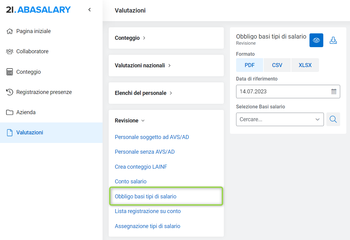 Queste componenti sono implementate nel programma come standard, in conformità con i regolamenti delle autorità fiscali e degli enti previdenziali. L'elenco "Obbligo basi tipi di salario", disponibile in "Valutazioni - Revisione", consente di individuare facilmente quali componenti sono soggetti a contributi base e quali no. Può essere aperto in formato PDF o come documento Excel.