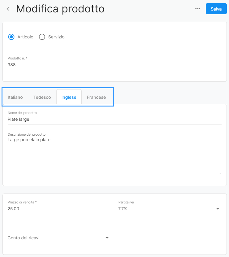 Il nome e la descrizione del prodotto possono ora essere inserite in tutte e 4 le lingue (DE, EN, FR e IT) separatamente nello stesso prodotto.
