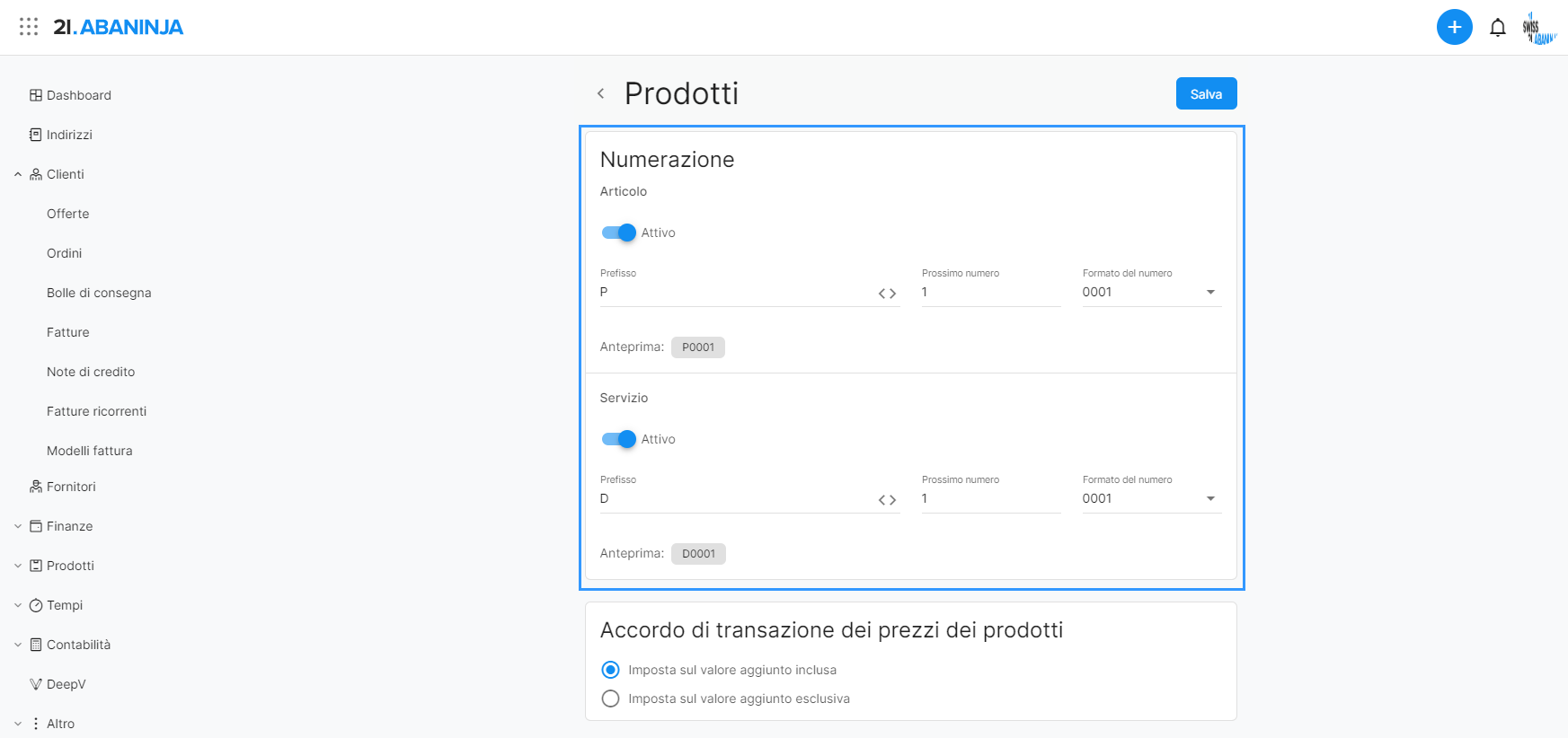 5. Dati base - Prodotti - Prefisso per la numerazione