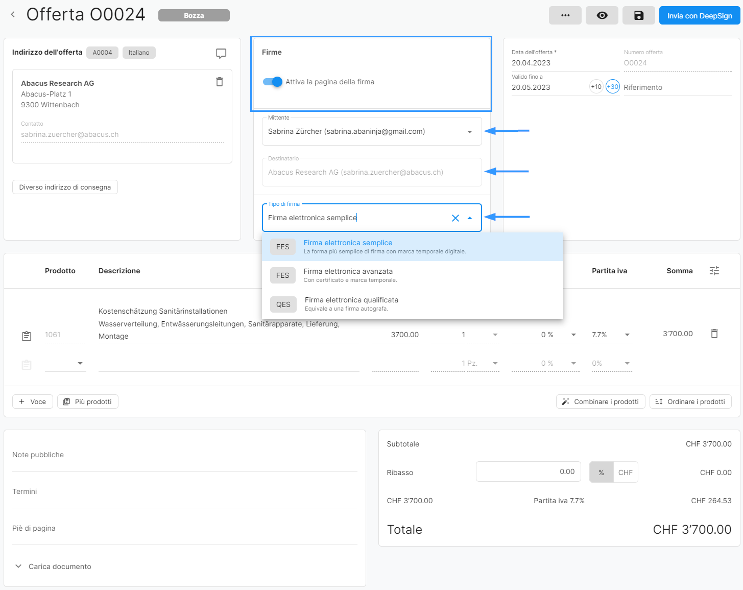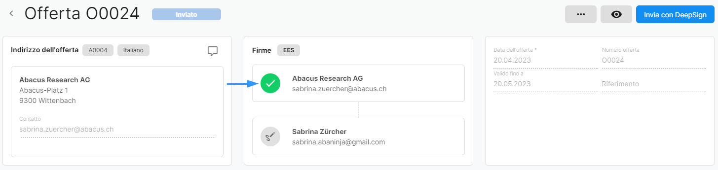 L'offerta viene quindi inviata con il pulsante Invia con DeepSign.