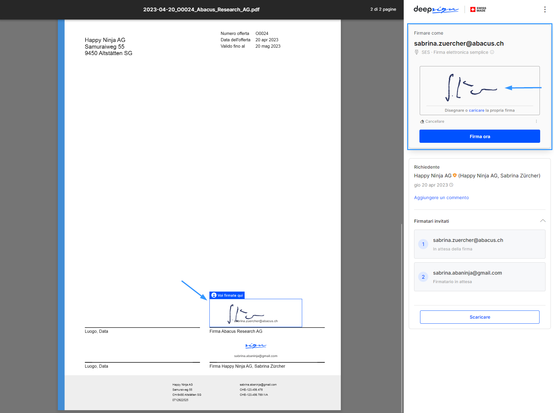 Dopo aver collegato una DeepBox ad AbaNinja è possibile firmare le nuove offerte con la firma elettronica DeepSign e inviarle.