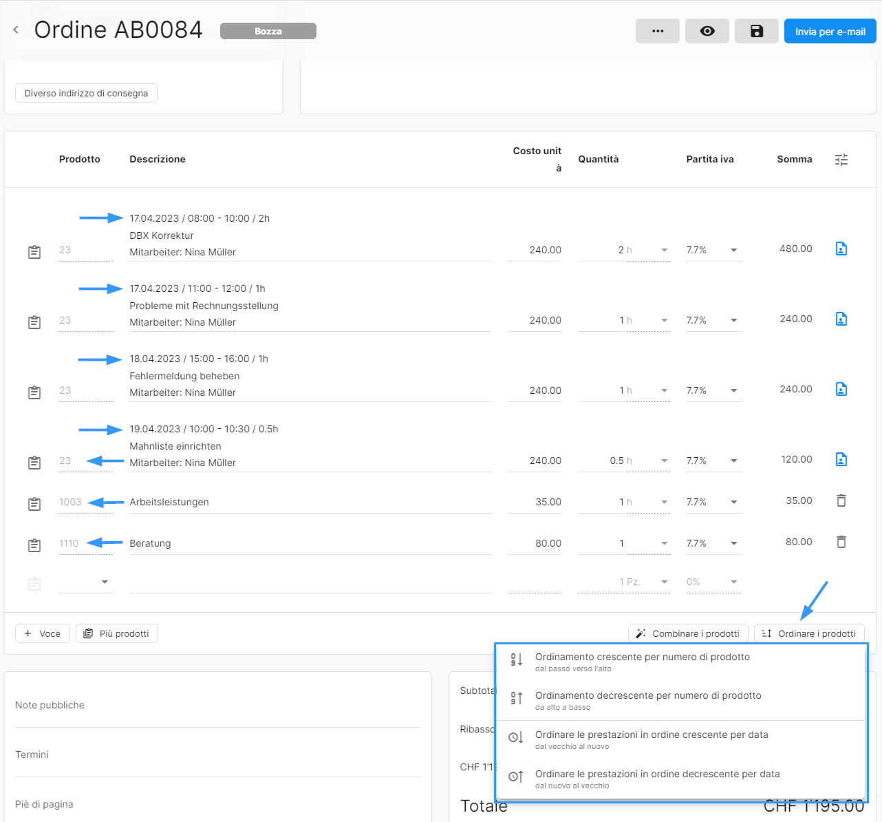 Tramite il nuovo pulsante Ordinare i prodotti, negli ordini è ora possibile ordinare le prestazioni create in ordine crescente o decrescente per data.