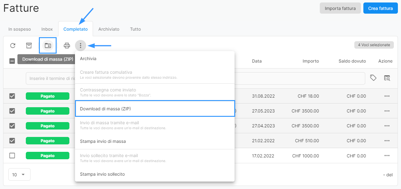 Ora è disponibile la funzione Download di massa (ZIP) per tutti i tipi di documenti.
