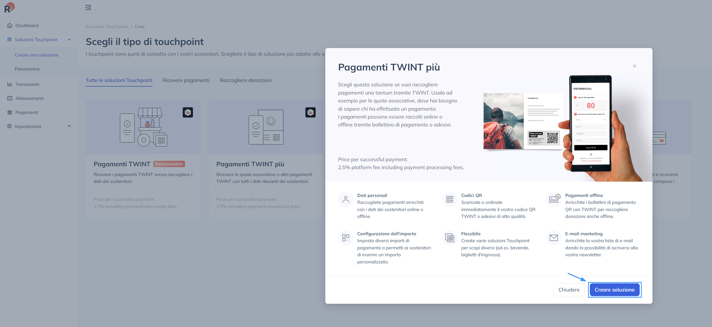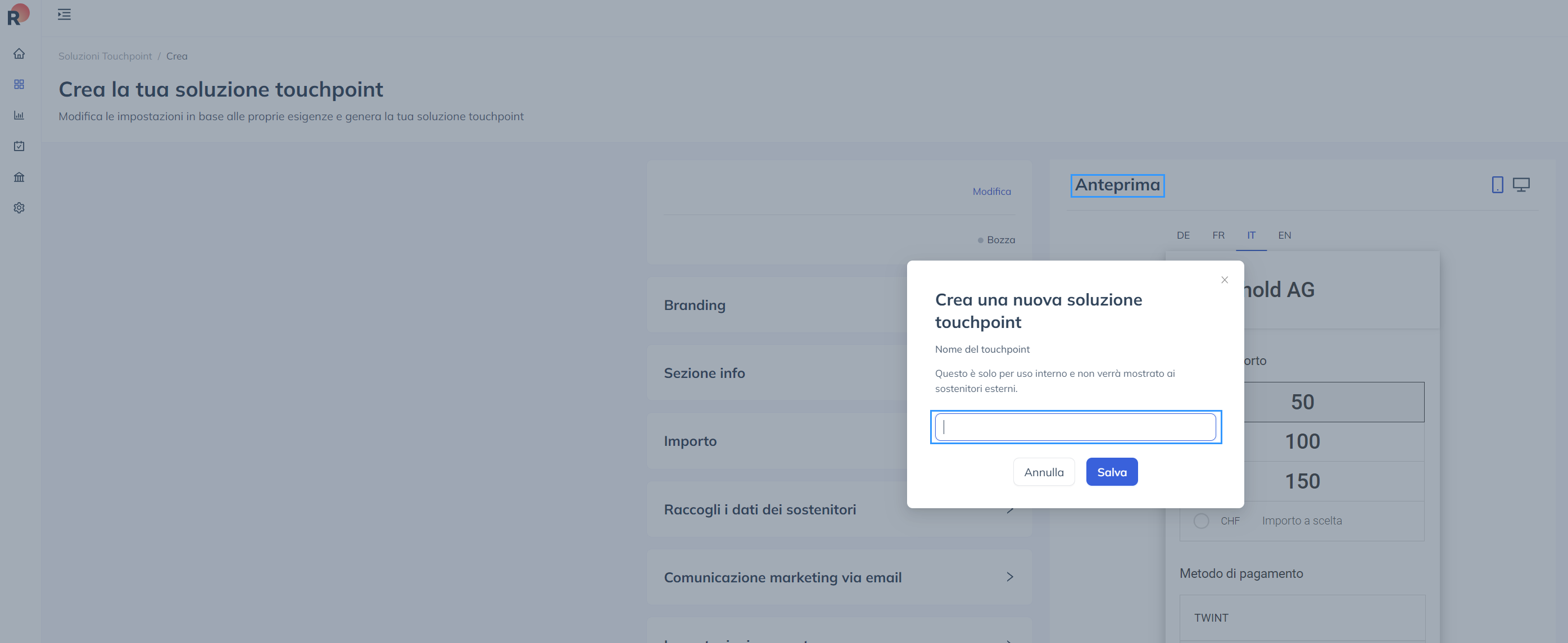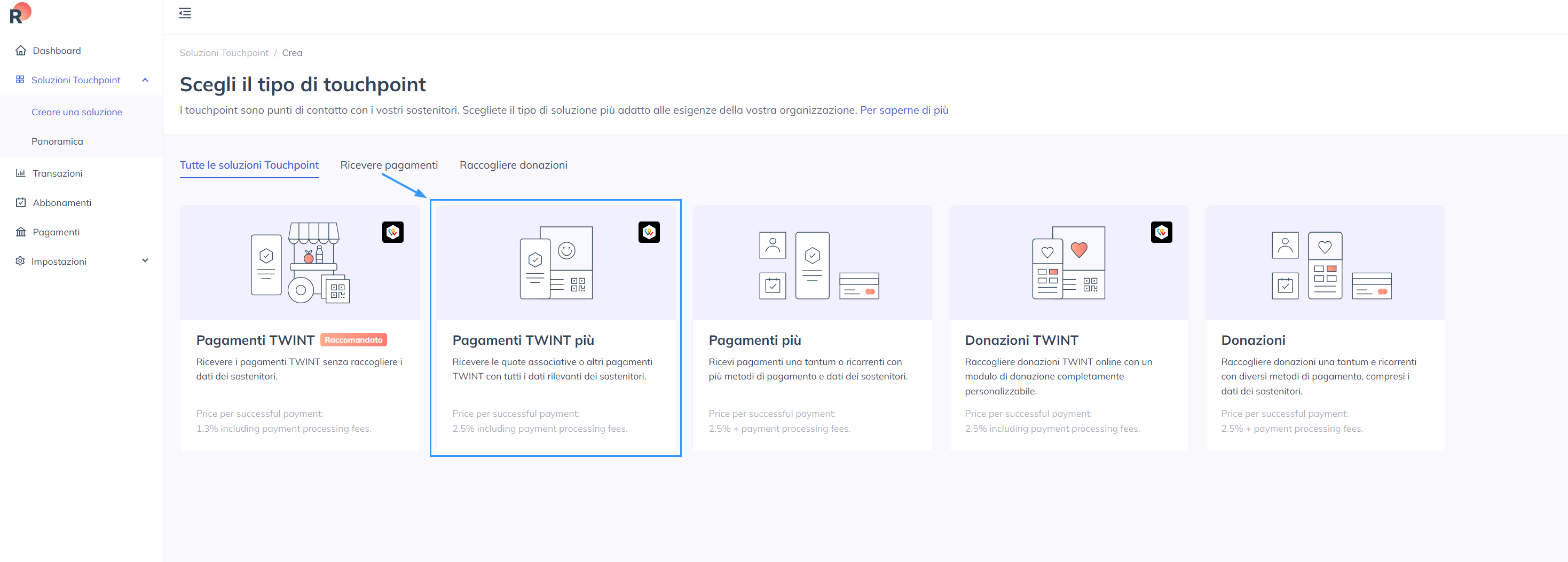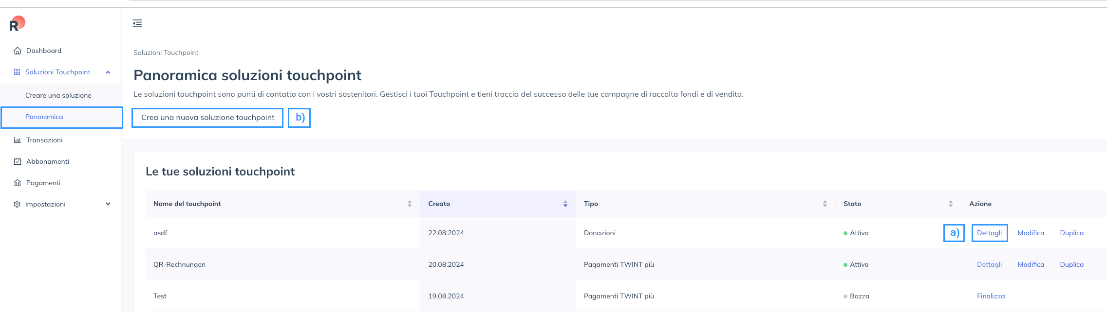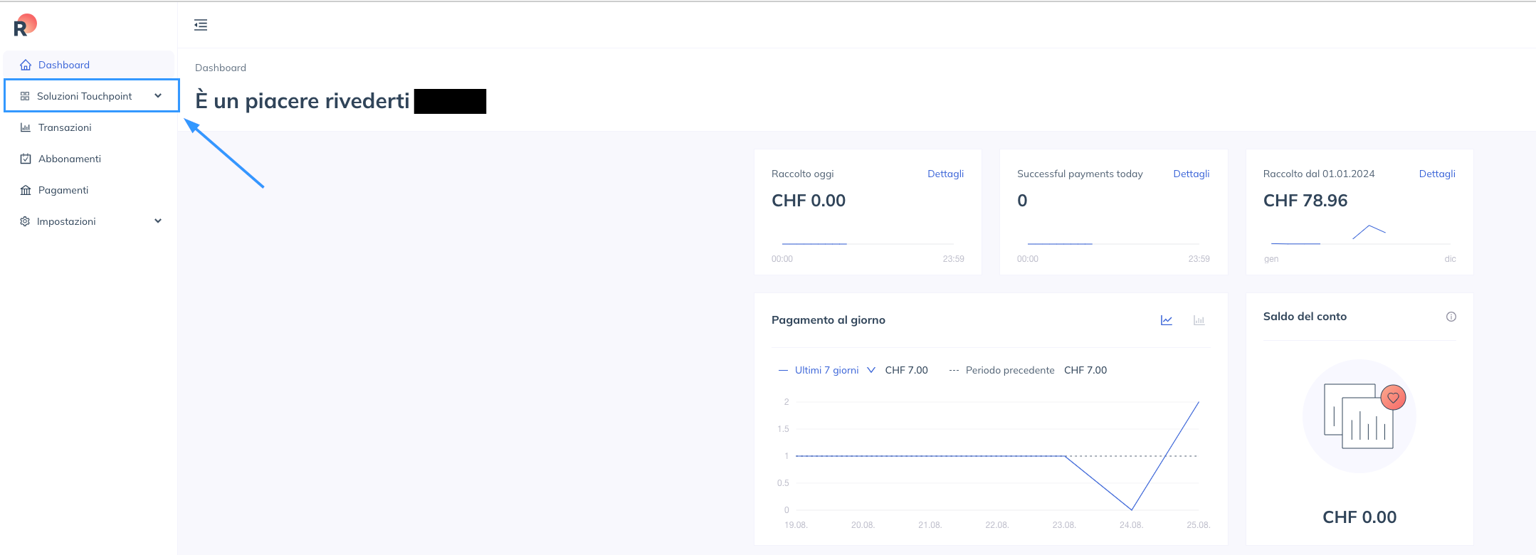- Effettuate il login a RaiseNow e accederete alla dashboard. Cliccate su Touchpoint Solutions nel menu a sinistra: