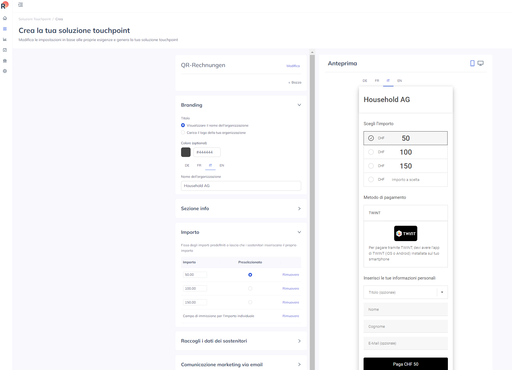 - Assegnare un nome al codice. Non è necessario effettuare impostazioni particolari. Tuttavia, il design può essere personalizzato. L'area di destra mostra ciò che viene visualizzato dal cliente dopo la scansione della fattura QR. (L'importo viene inserito automaticamente):