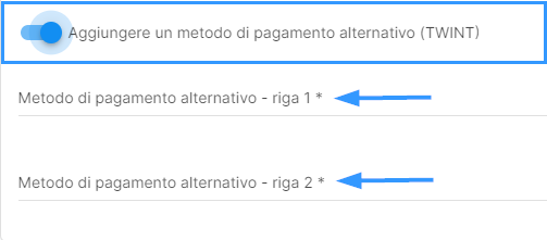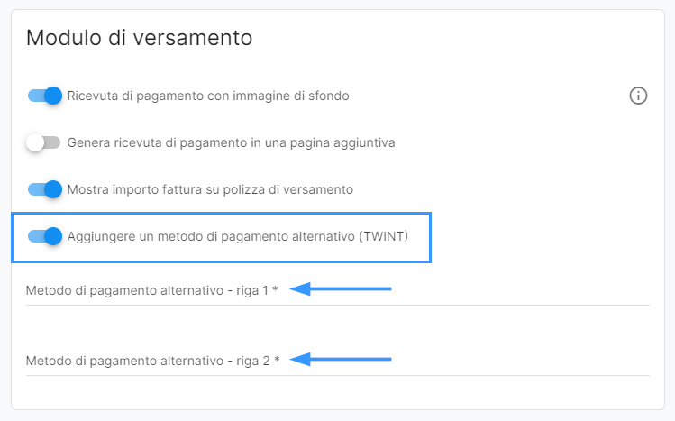 In Impostazioni > Clienti > Fatture > Modulo di versamento è possibile attivare la funzione Aggiungere un metodo di pagamento alternativo (TWINT).